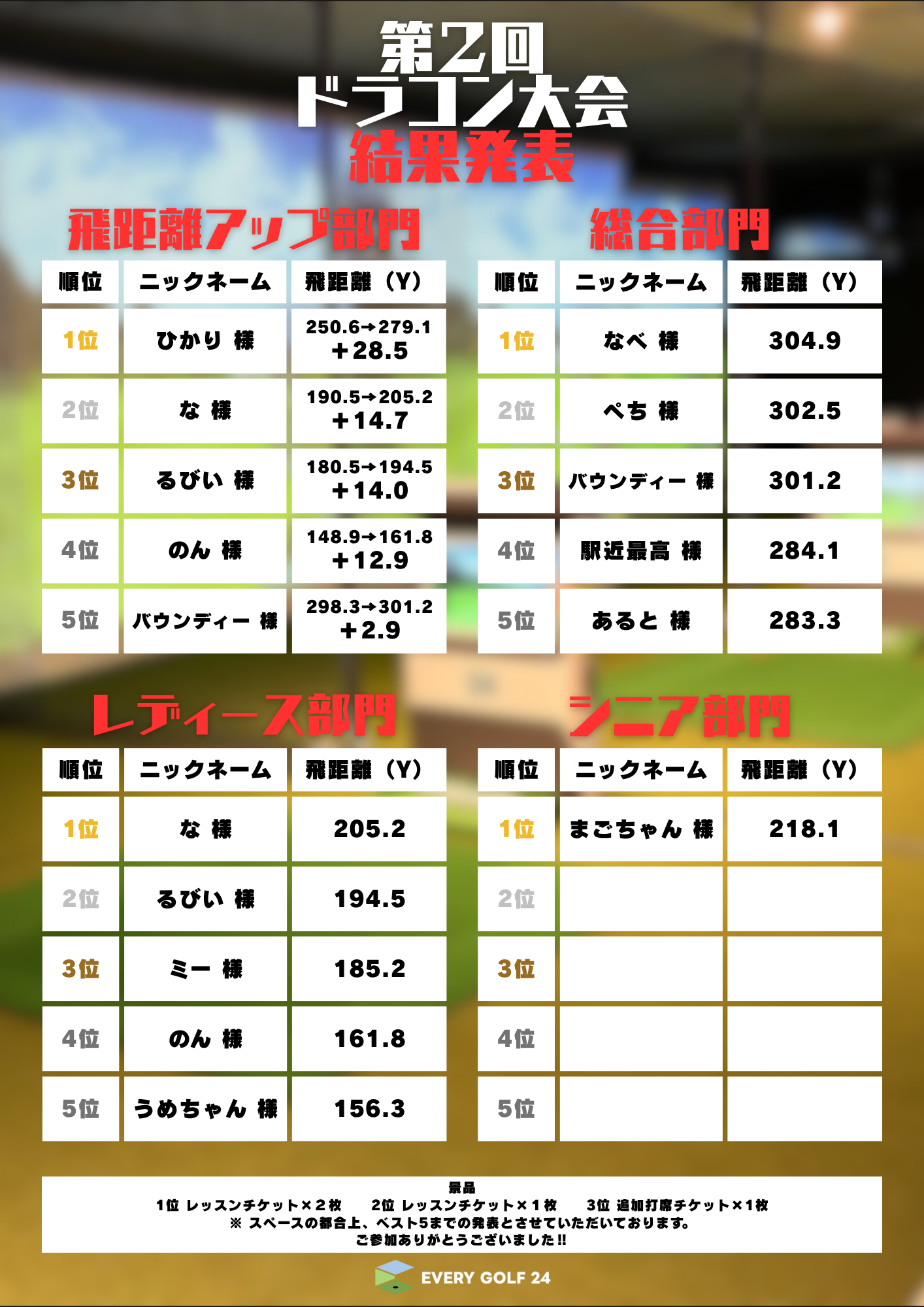 2025年7月25日〜8月7日に開催いたしました「第2回 ドラコン大会」は、多くの会員様にご参加いただき、盛況のうちに終了いたしました。