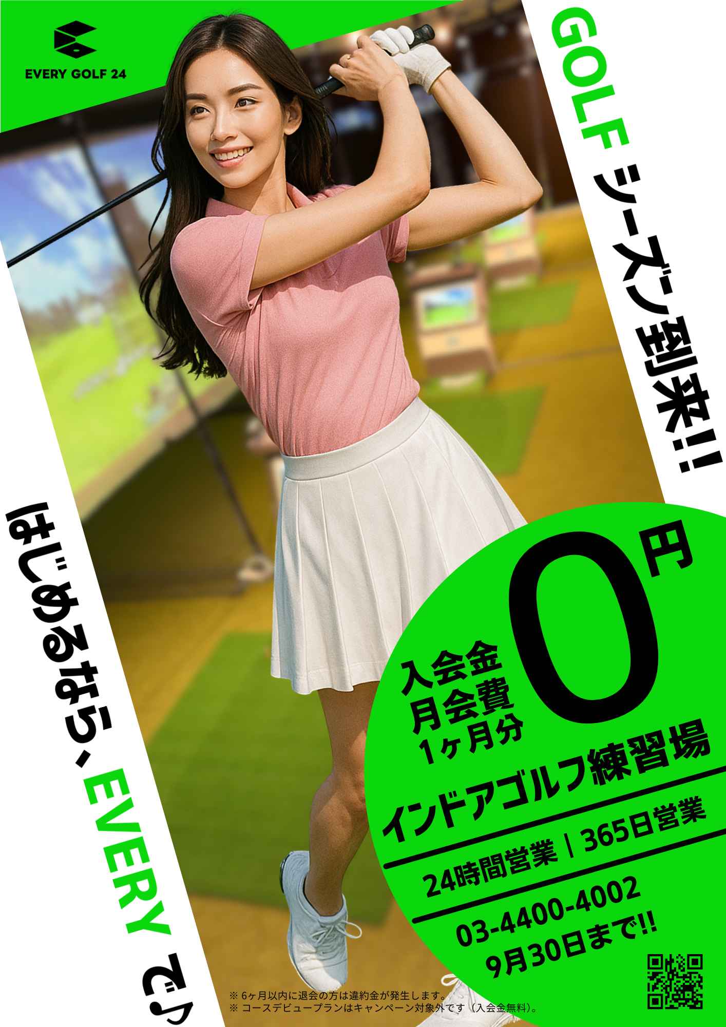 ~9月 キャンペーン~ ■入会金0円 ■月会費1ヶ月分無料 9月30日まで! ※コースデビュープランはキャンペーン対象外です(入会金0円) ご入会お待ちしております♪ » 入会申し込み・予約ページへ 9月キャンペーン 2025年9月1日Post navigationPreviousPrevious post:EVERY GOLF 24 1周年記念インドアコンペ&懇親会 ご報告NextNext post:第4回 インドアゴルフカップ 開催