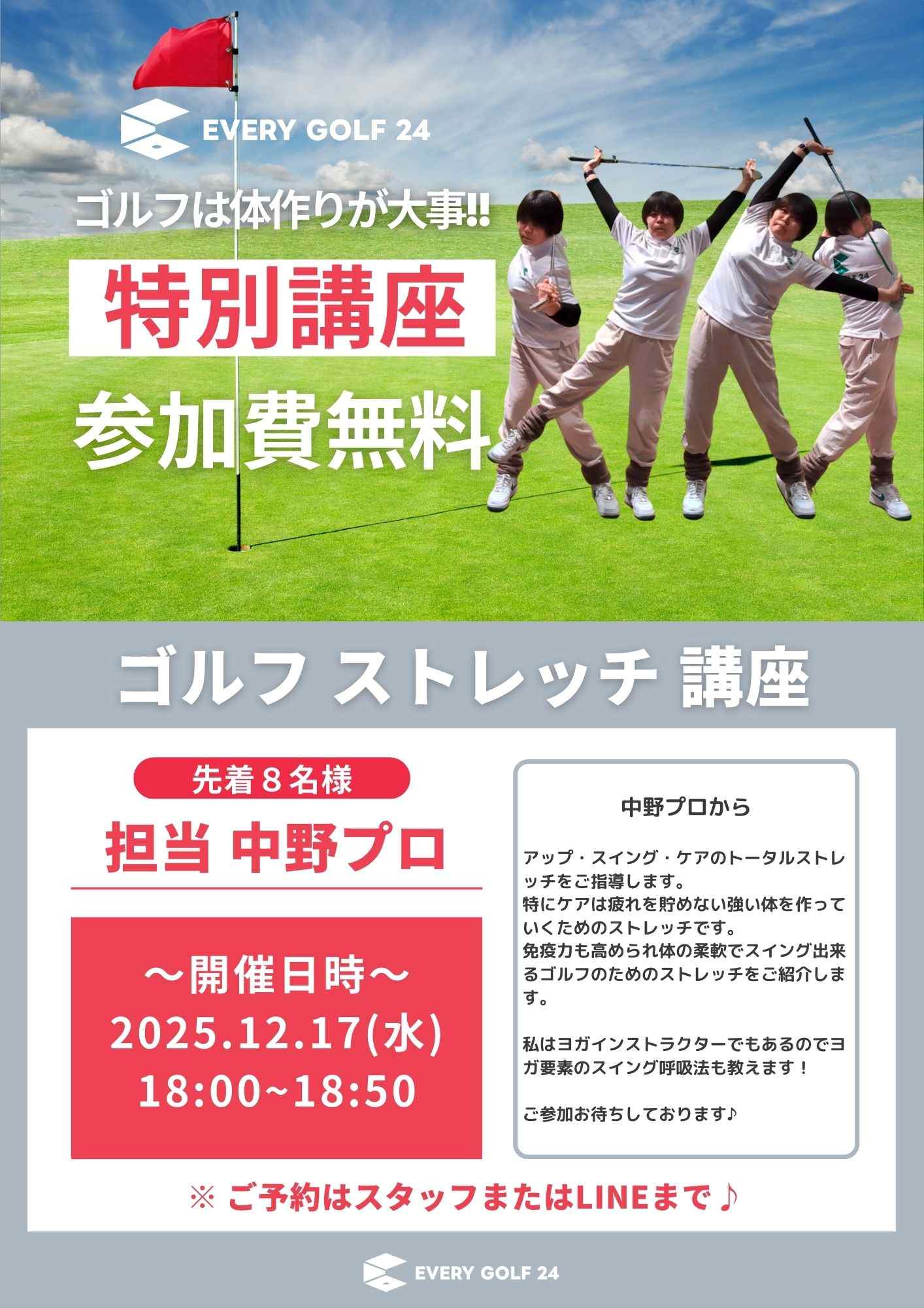 講師は中野プロが担当し、ヨガインストラクターとしての経験を活かして、呼吸を取り入れた効率的なスイングづくりもあわせて指導いたします。