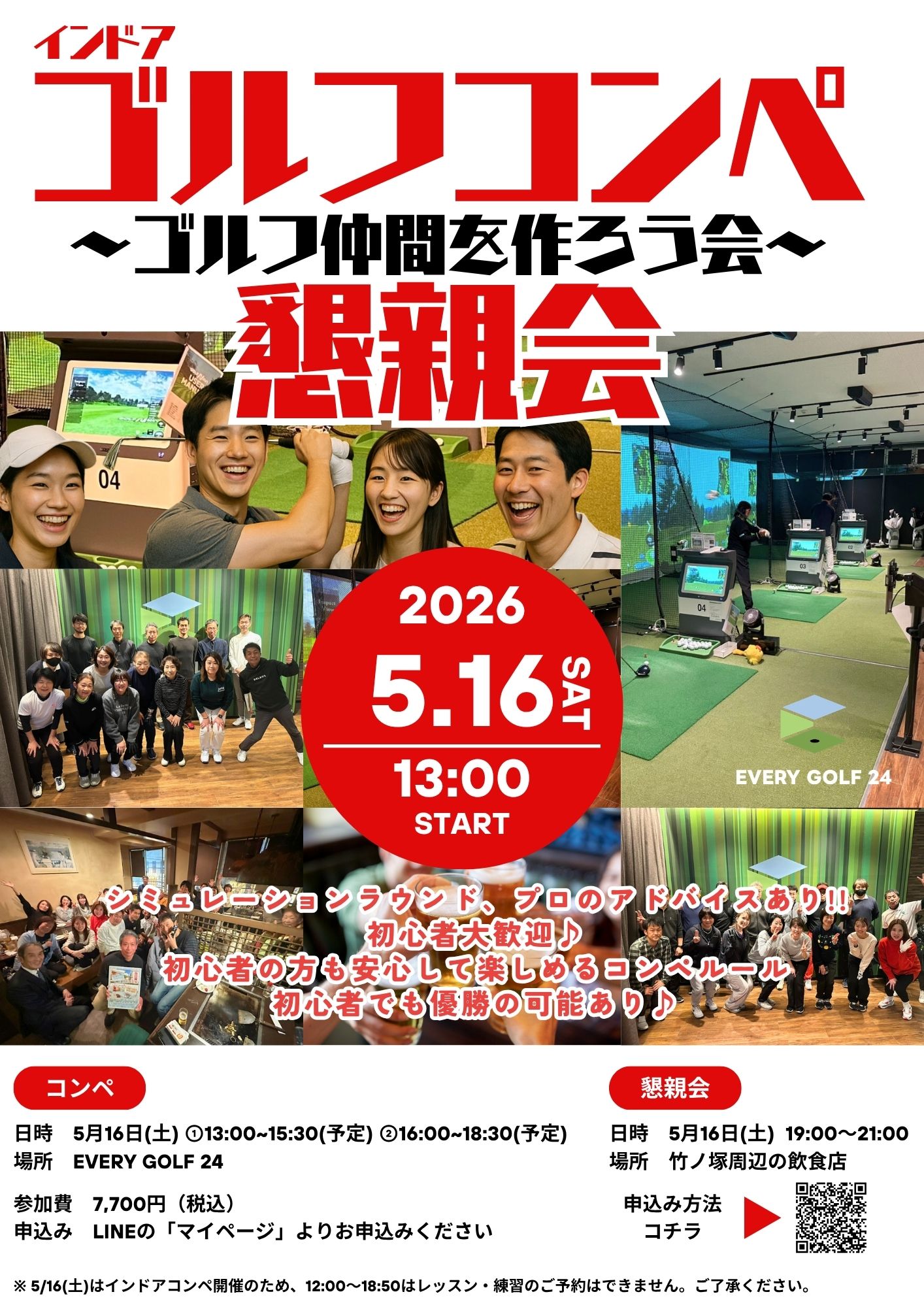 ※5月16日(土)はインドアコンペ開催のため、12:00~18:50はレッスン・練習のご予約はできません。あらかじめご了承ください。