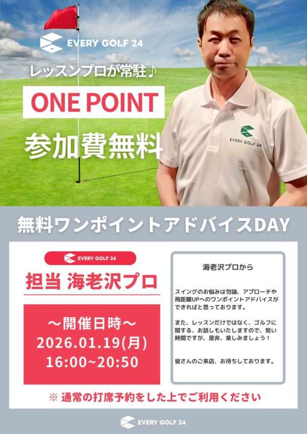 無料ワンポイントアドバイスDAY 開催! EVERY GOLF 24では、レッスンプロ常駐の特別イベント「無料ワンポイントアドバイスDAY」を開催いたします。 スイングのお悩みはもちろん、アプローチや飛距離アップなど…